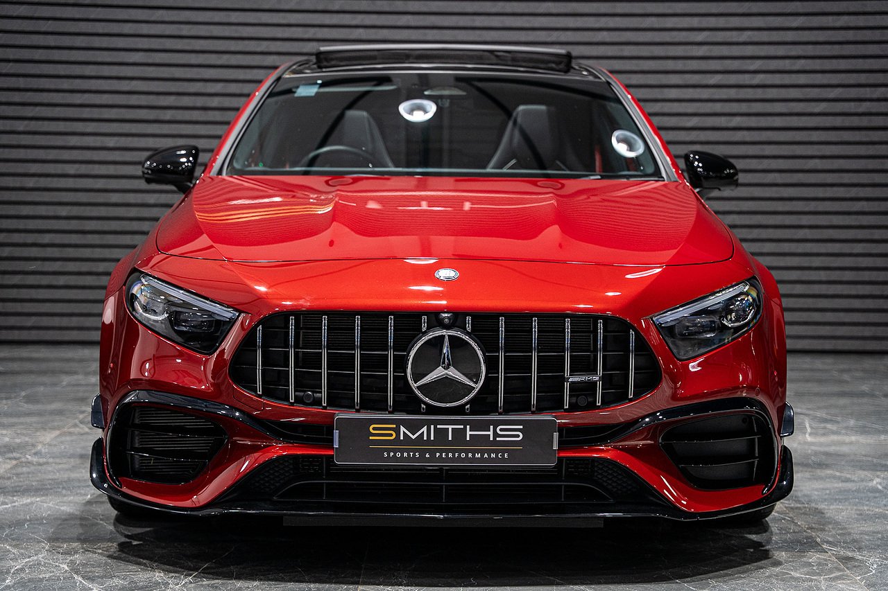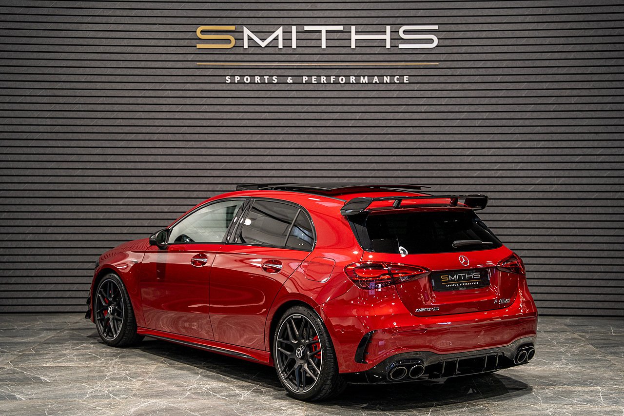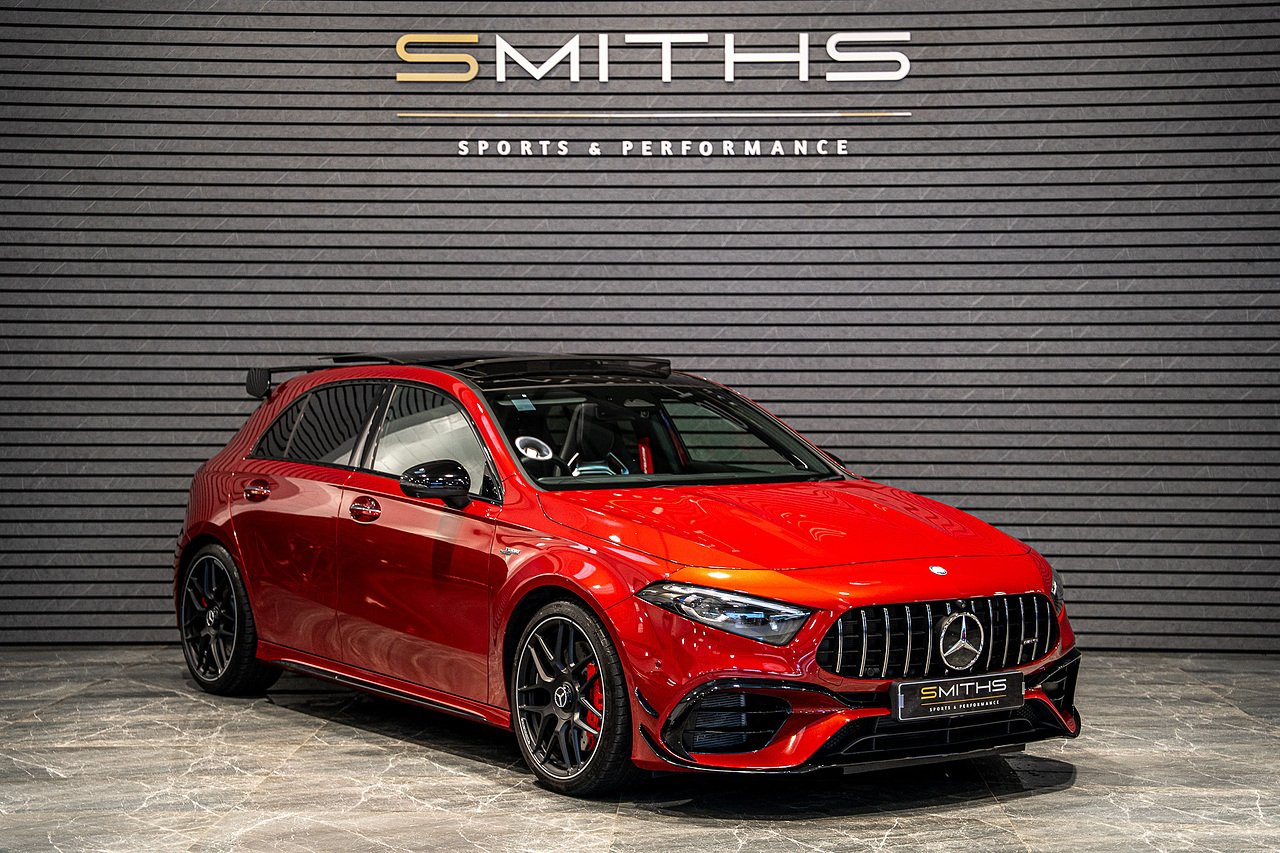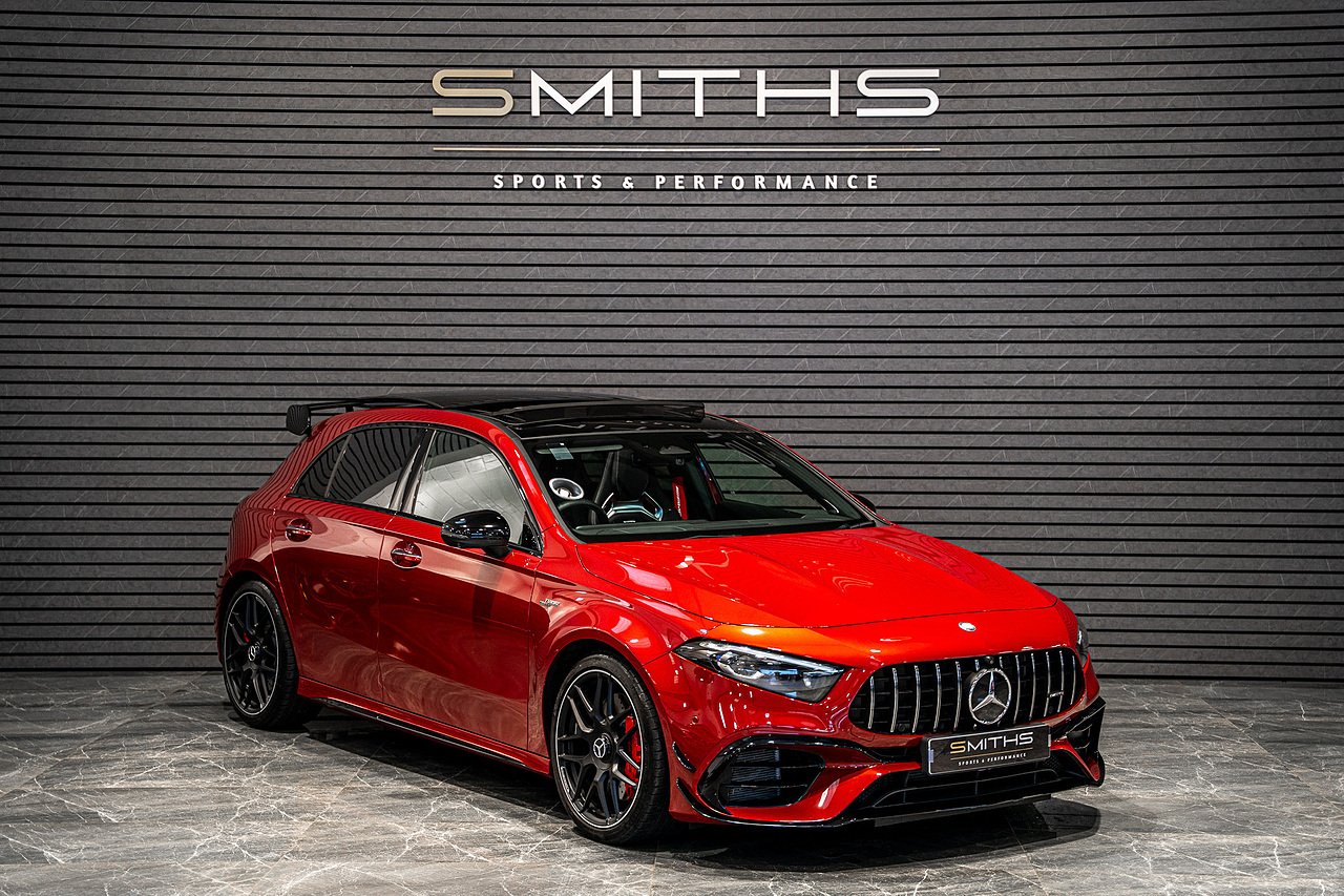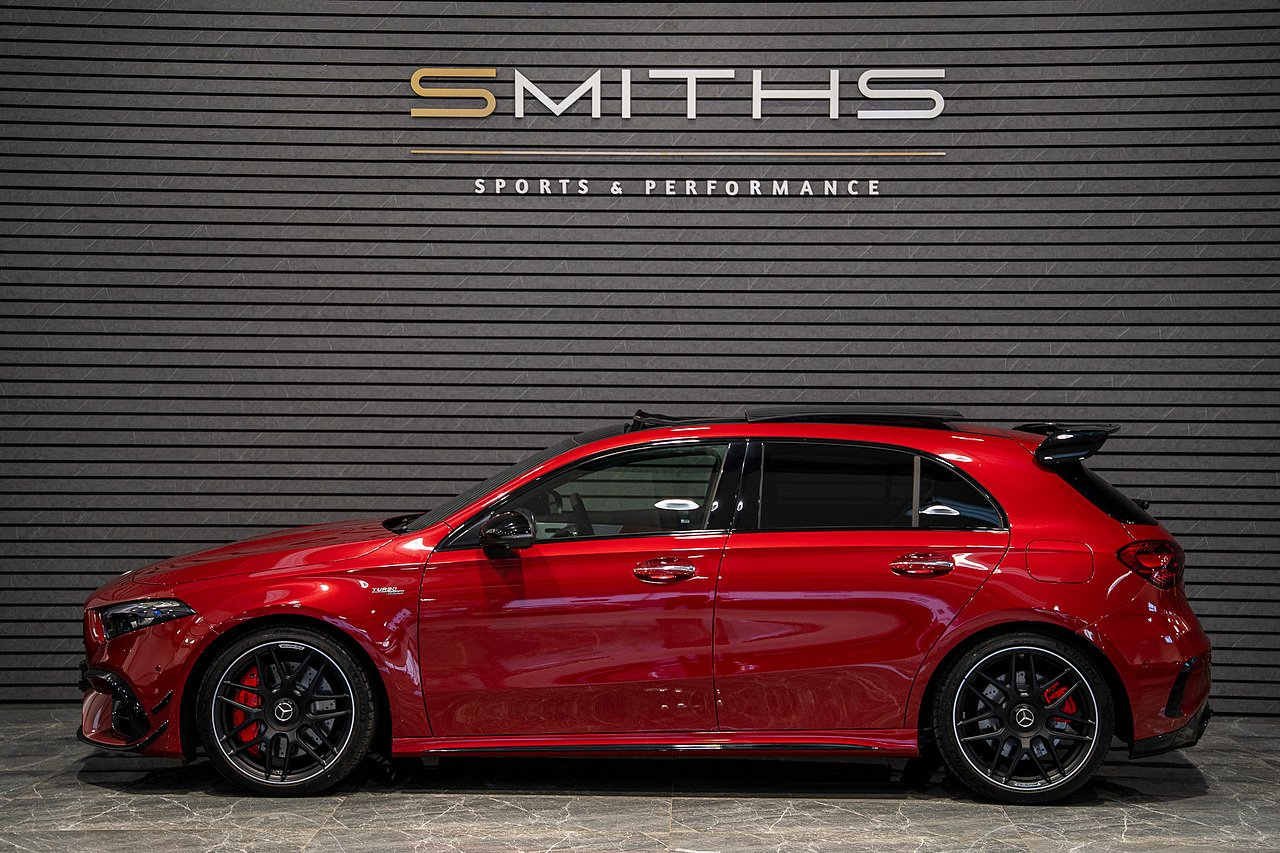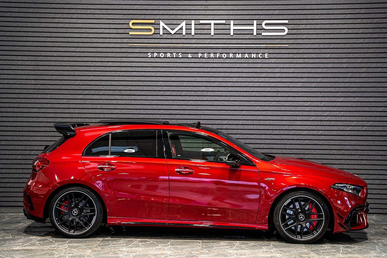 WOW! Just into stock is this stunning example of a 2023 Mercedes A45 AMG S Plus finished in Patagonia Red. 1 owner from new with just 3300 miles on the clock. Facelifted model including updated headlights and taillights, newer steering wheel and upgraded entertainment system. Factory specification includes the Sliding Panoramic Sunroof, Burmester Surround Sound, Head Up Display, 360 Cameras, Heated Memory Bucket Seats, Privacy Glass ++ The facelifted models come with the AMG Aerodynamics package including front splitter, rear diffuser and spoiler. Backed up by 2 Mercedes main dealer services for peace of mind. At Smiths Sports and Performance we tailor finance packages to suit you. The options available are Hire purchase (HP) and PCP (Age of vehicle dependant). These will be quoted at the most competitive market rates currently available. Please discuss the options with one of our team and we will help find the best option to suit your needs. If you have a part exchange, our buying team will value it manually according to the current market value to achieve the best possible figures to help you into your new car. All of our vehicles come with a 3 month back to base warranty & we also offer extended warranty options for optional periods, with the ability to upgrade to access manufacturer dealerships for any potential work carried out. Every car we sell is checked that it is HPI clear and then put through a workshop inspection. We service and MOT where needed and provide warranty for your peace of mind. We are open 6 days a week by appointment only. Please call to arrange a viewing. The vehicle specification displayed may not be exact for this vehicle. Please contact us to confirm the precise specifications.